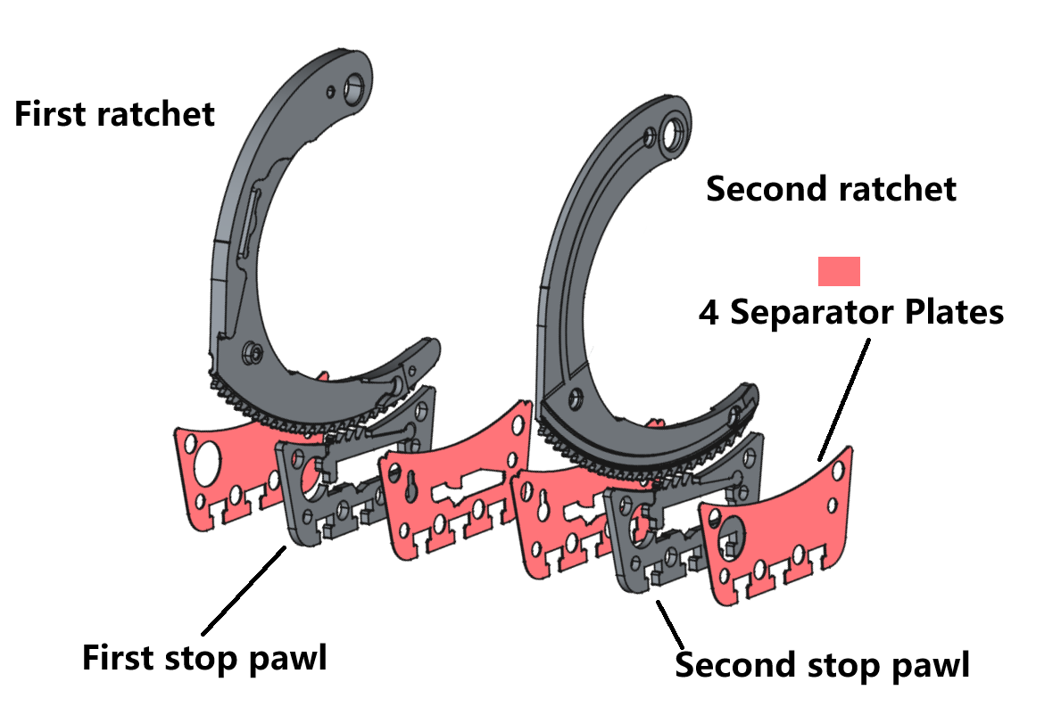 3), Two anti-shimming notches on both the stop pawls prevent the handcuffs from being shimmed with sharp tools. The notches are positioned to catch any pointing tip reached from outside. The gears can be removed only when both locks are disengaged at same time by a special key, it is much more difficult to be picked in comparison to a conventional one.
